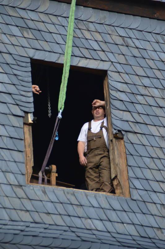 Im Anschluss an die Andacht wurden die zwei alten Glocken mit einem Kran aus dem Turm gehoben. Zwischenzeitlich hatten die Besucher die Gelegenheit, das neue Glockentrio in Augenschein zu nehmen. Die kleinste und eine der drei Bestandsglocken bleibt der Gemeinde erhalten. Sie wurde im Juli in der Glockengießerei restauriert. So auch ihr altes Holzjoch, welches aufgearbeitet wurde, um nun wieder seinen alten Platz im Turm einzunehmen. Die neue große und im April in Passau gegossene „Schöpfungsglocke“ wiegt etwa 560 Kilogramm, die mittlere, öffentlich am 4. Juli in Apolda schaugegossene „Ewigkeitsglocke“ etwa 320 Kilogramm. Deutlich leichter und kleiner als ihre Vorgänger. Beide Glocken erhielten neue Eichenholz-Joche.