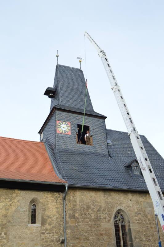 Im Anschluss an die Andacht wurden die zwei alten Glocken mit einem Kran aus dem Turm gehoben. Zwischenzeitlich hatten die Besucher die Gelegenheit, das neue Glockentrio in Augenschein zu nehmen. Die kleinste und eine der drei Bestandsglocken bleibt der Gemeinde erhalten. Sie wurde im Juli in der Glockengießerei restauriert. So auch ihr altes Holzjoch, welches aufgearbeitet wurde, um nun wieder seinen alten Platz im Turm einzunehmen. Die neue große und im April in Passau gegossene „Schöpfungsglocke“ wiegt etwa 560 Kilogramm, die mittlere, öffentlich am 4. Juli in Apolda schaugegossene „Ewigkeitsglocke“ etwa 320 Kilogramm. Deutlich leichter und kleiner als ihre Vorgänger. Beide Glocken erhielten neue Eichenholz-Joche.